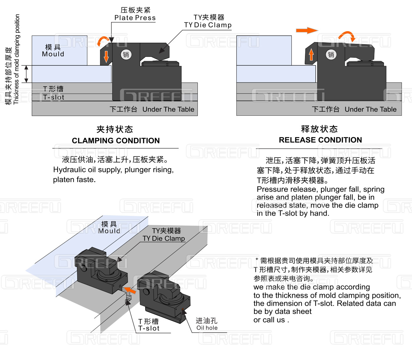 * 需根據(jù)貴司使用模具夾持部位厚度及T形槽尺寸,制作夾模器,相關(guān)參數(shù)詳見(jiàn)參照表或來(lái)電咨詢(xún)