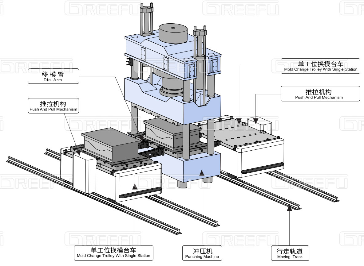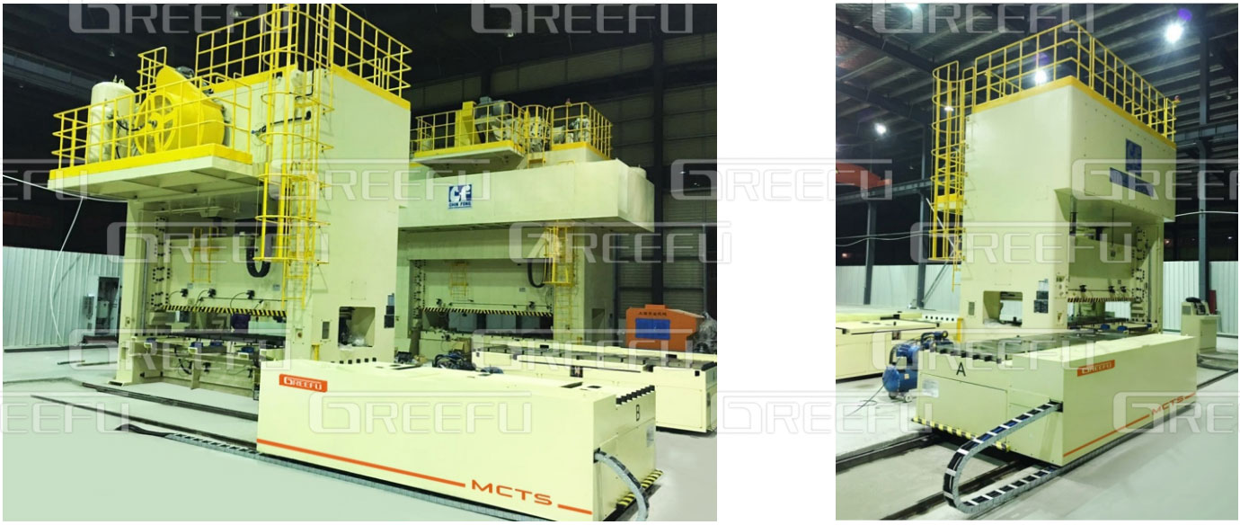 多臺沖床共用一套自動換模臺車系統(tǒng),該“自動換模臺車系統(tǒng)”能有效解決大型模具的換模作業(yè),如汽車鈑金、家電電梯等行業(yè)沖壓零件,且格萊富可依各種獨立作業(yè)需求研究開發(fā)各種搬運臺車,并可設(shè)計單鍵全自動或半自動對模具的搬入搬出,同時,現(xiàn)在該模具輸送系統(tǒng)也已逐漸被業(yè)內(nèi)接受與采用,尤其是,汽機車零組件等需大型模具的制造業(yè)等。